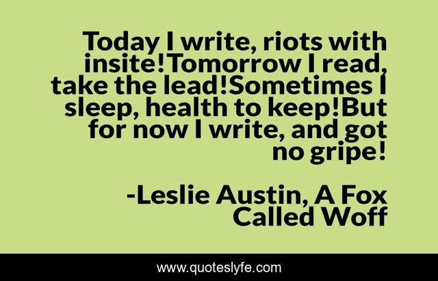 This page presents the quote "Today I write, riots with insite!Tomorrow I read, take the lead!Sometimes I sleep, health to keep!But for now I write, and got no gripe!". Author of this quote is Leslie Austin, A Fox Called Woff. This quote is about poem, author, poetry, poems,.