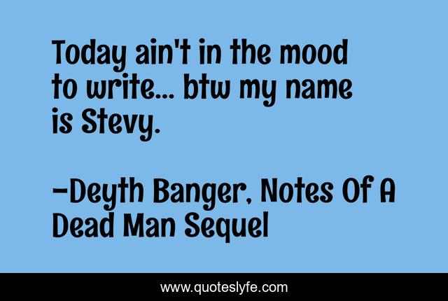 This page presents the quote "Today ain't in the mood to write... btw my name is Stevy.". Author of this quote is Deyth Banger, Notes Of A Dead Man Sequel. This quote is about write, to, mood,.