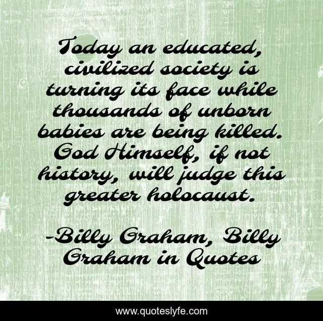 This page presents the quote "Today an educated, civilized society is turning its face while thousands of unborn babies are being killed. God Himself, if not history, will judge this greater holocaust.". Author of this quote is Billy Graham, Billy Graham in Quotes. This quote is about knowledge, billy-graham,.