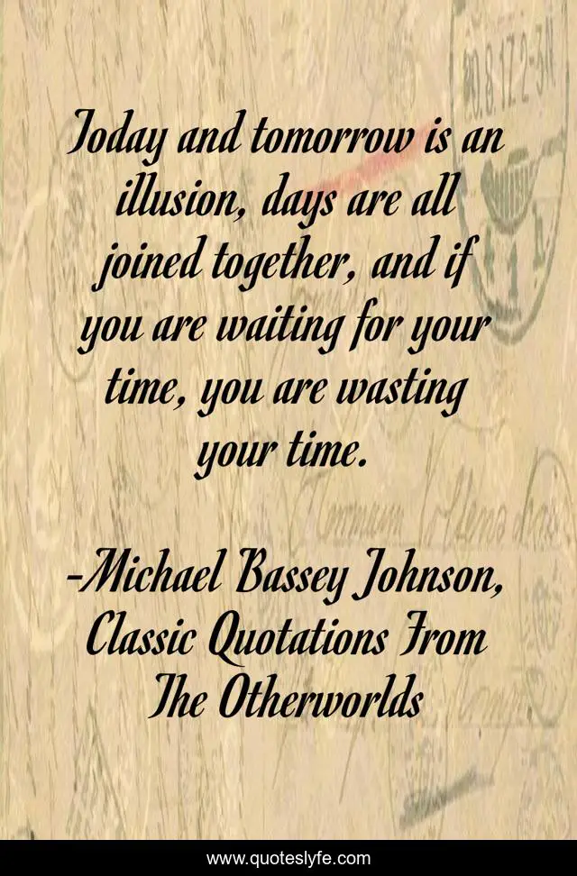 This page presents the quote "Today and tomorrow is an illusion, days are all joined together, and if you are waiting for your time, you are wasting your time.". Author of this quote is Michael Bassey Johnson, Classic Quotations From The Otherworlds. This quote is about confidence, right-time, illusion, deeds, days, nonconformist, tomorrow, waiting, procrastination,.