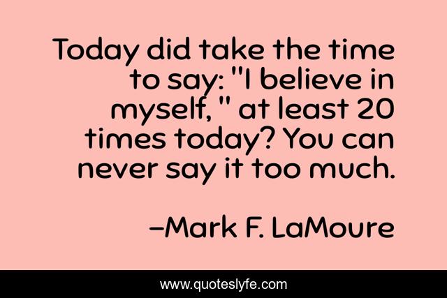 This page presents the quote "Today did take the time to say: "I believe in myself, " at least 20 times today? You can never say it too much.". Author of this quote is Mark F. LaMoure. This quote is about motivation, success, excellent-people, excellence, self-improvement, inspirational, excellent, enthusiasm,.