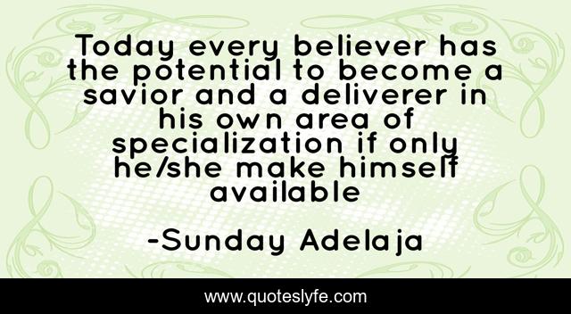 This page presents the quote "Today every believer has the potential to become a savior and a deliverer in his own area of specialization if only he/she make himself available". Author of this quote is Sunday Adelaja. This quote is about available, specialization, area, believer, potential, savior, deliverer, today,.