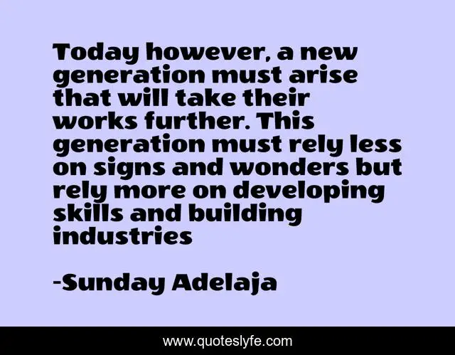 This page presents the quote "Today however, a new generation must arise that will take their works further. This generation must rely less on signs and wonders but rely more on developing skills and building industries". Author of this quote is Sunday Adelaja. This quote is about building, industries, rely, arise, developing, generation, less, however, but,.