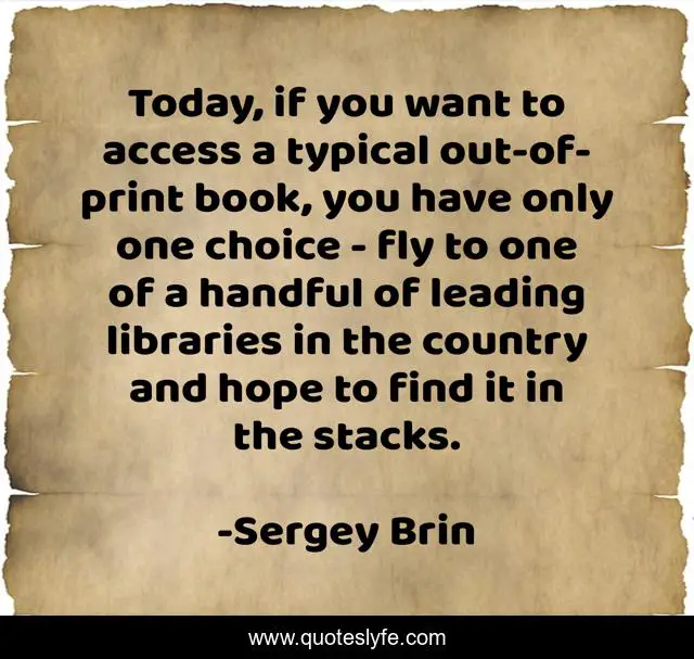 This page presents the quote "Today, if you want to access a typical out-of-print book, you have only one choice - fly to one of a handful of leading libraries in the country and hope to find it in the stacks.". Author of this quote is Sergey Brin. This quote is about book, today, choice,.