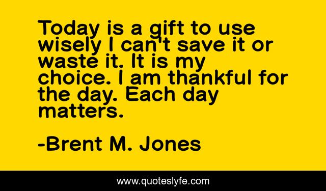 This page presents the quote "Today is a gift to use wisely I can't save it or waste it. It is my choice. I am thankful for the day. Each day matters.". Author of this quote is Brent M. Jones. This quote is about use-wisely, today,.