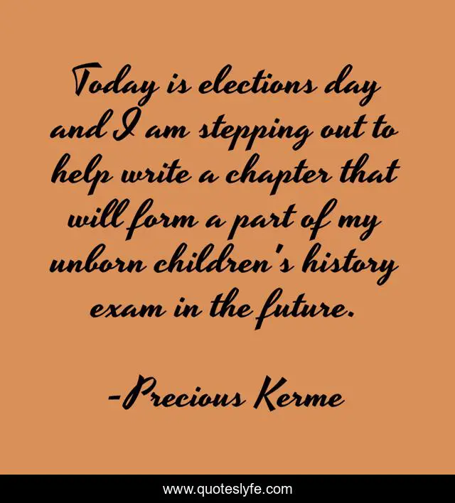 This page presents the quote "Today is elections day and I am stepping out to help write a chapter that will form a part of my unborn children's history exam in the future.". Author of this quote is Precious Kerme. This quote is about future, patriotism, elections, proud,.