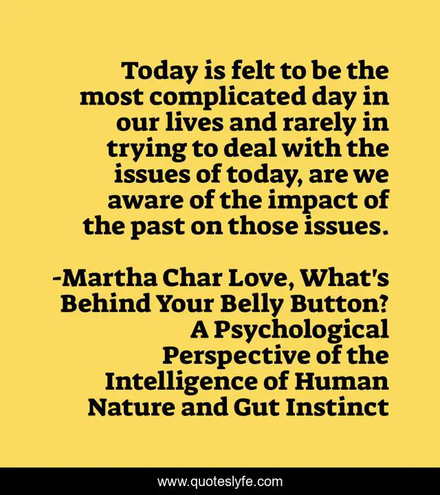 This page presents the quote "Today is felt to be the most complicated day in our lives and rarely in trying to deal with the issues of today, are we aware of the impact of the past on those issues.". Author of this quote is Martha Char Love, What's Behind Your Belly Button? A Psychological Perspective of the Intelligence of Human Nature and Gut Instinct. This quote is about gut-awareness, emotions, gut-feelings, gut-instincts,.
