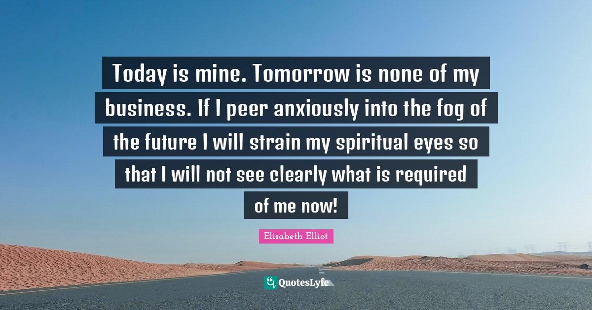 This page presents the quote "Today is mine. Tomorrow is none of my business. If I peer anxiously into the fog of the future I will strain my spiritual eyes so that I will not see clearly what is required of me now!". Author of this quote is Elisabeth Elliot. This quote is about inspiring, today, spiritual, eye, business, future, strain, fog, tomorrow,.