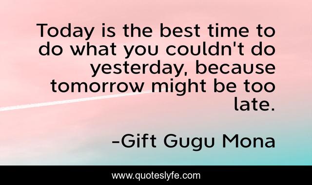 This page presents the quote "Today is the best time to do what you couldn't do yesterday, because tomorrow might be too late.". Author of this quote is Gift Gugu Mona. This quote is about best-time, yesterday, could-not-do, too-late, tomorrow, today,.