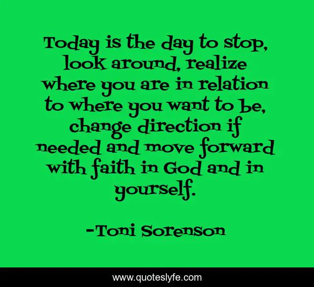 This page presents the quote "Today is the day to stop, look around, realize where you are in relation to where you want to be, change direction if needed and move forward with faith in God and in yourself.". Author of this quote is Toni Sorenson. This quote is about faith, life, god, choices, change, happiness,.