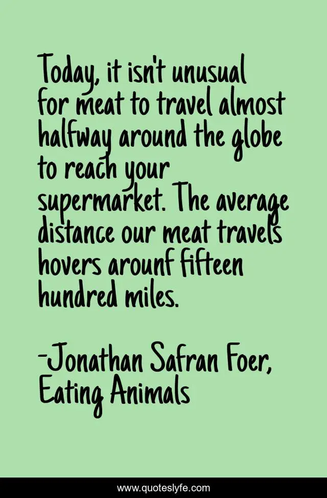 This page presents the quote "Today, it isn't unusual for meat to travel almost halfway around the globe to reach your supermarket. The average distance our meat travels hovers arounf fifteen hundred miles.". Author of this quote is Jonathan Safran Foer, Eating Animals. This quote is about food-for-thought, animals, meat,.
