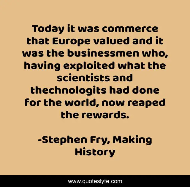 This page presents the quote "Today it was commerce that Europe valued and it was the businessmen who, having exploited what the scientists and thechnologits had done for the world, now reaped the rewards.". Author of this quote is Stephen Fry, Making History. This quote is about science, capitalism, business, commerce,.