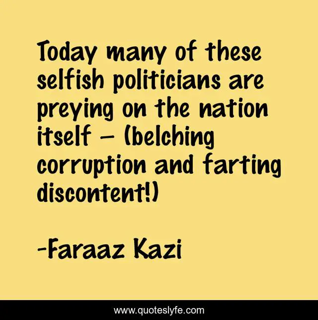 This page presents the quote "Today many of these selfish politicians are preying on the nation itself – (belching corruption and farting discontent!)". Author of this quote is Faraaz Kazi. This quote is about politics, politicians, nationalism,.
