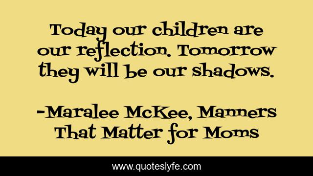 This page presents the quote "Today our children are our reflection. Tomorrow they will be our shadows.". Author of this quote is Maralee McKee, Manners That Matter for Moms. This quote is about etiquette, manners, etiquette-and-attitude, inspirational, enthusiasm, children, christian-living,.