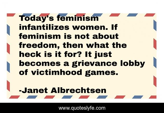 This page presents the quote "Today's feminism infantilizes women. If feminism is not about freedom, then what the heck is it for? It just becomes a grievance lobby of victimhood games.". Author of this quote is Janet Albrechtsen. This quote is about victimhood, feminist, infantilisation, antifeminism, antifeminist, victimhoodpolitics, infantilization, victimmentality, feminism,.