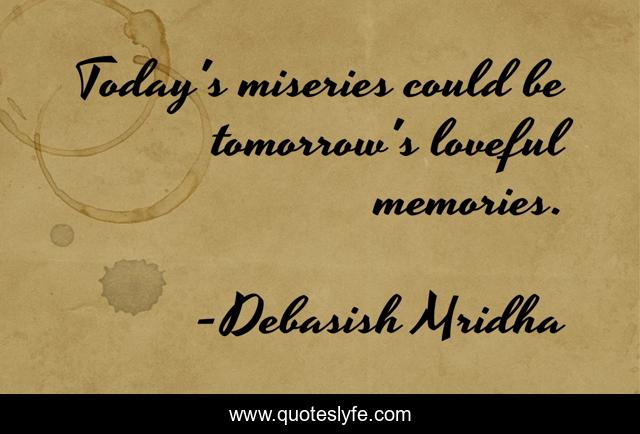 This page presents the quote "Today's miseries could be tomorrow's loveful memories.". Author of this quote is Debasish Mridha. This quote is about life, love, knowledge, inspirational, intelligence, philosophy, wisdom, quotes, affection,.