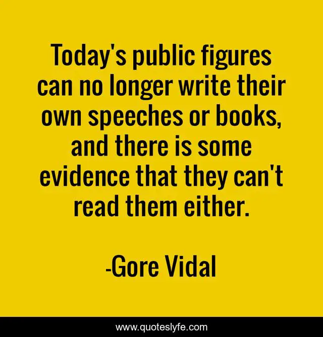 This page presents the quote "Today's public figures can no longer write their own speeches or books, and there is some evidence that they can't read them either.". Author of this quote is Gore Vidal. This quote is about politicians, speeches,.