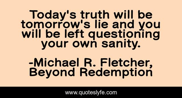 This page presents the quote "Today's truth will be tomorrow's lie and you will be left questioning your own sanity.". Author of this quote is Michael R. Fletcher, Beyond Redemption. This quote is about lies, delusion, truth, manipulation,.