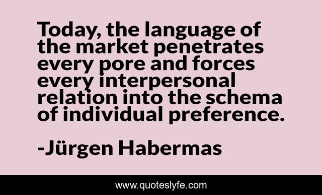 This page presents the quote "Today, the language of the market penetrates every pore and forces every interpersonal relation into the schema of individual preference.". Author of this quote is Jürgen Habermas. This quote is about marxism, modernity, capitalism,.