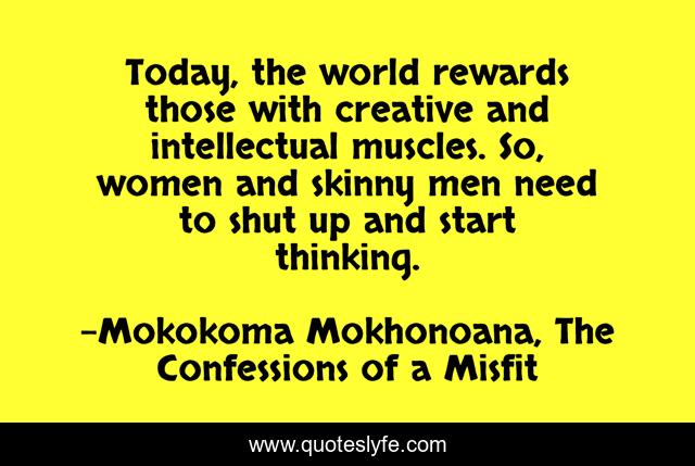 This page presents the quote "Today, the world rewards those with creative and intellectual muscles. So, women and skinny men need to shut up and start thinking.". Author of this quote is Mokokoma Mokhonoana, The Confessions of a Misfit. This quote is about hard-labor, creativity, ideas, intellect,.