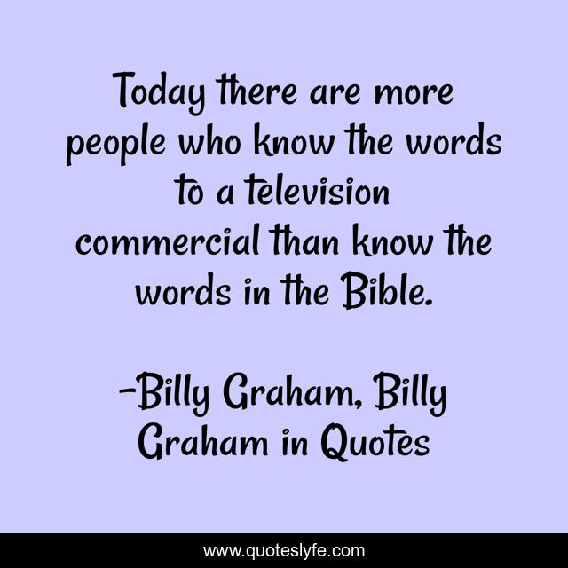 This page presents the quote "Today there are more people who know the words to a television commercial than know the words in the Bible.". Author of this quote is Billy Graham, Billy Graham in Quotes. This quote is about bible, billy-graham,.