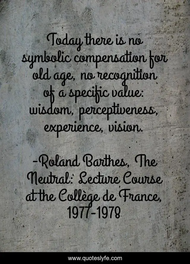 This page presents the quote "Today there is no symbolic compensation for old age, no recognition of a specific value: wisdom, perceptiveness, experience, vision.". Author of this quote is Roland Barthes, The Neutral: Lecture Course at the Collège de France, 1977-1978. .