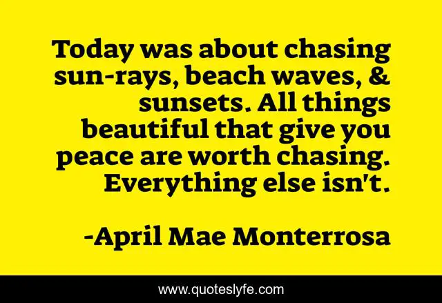 This page presents the quote "Today was about chasing sun-rays, beach waves, & sunsets. All things beautiful that give you peace are worth chasing. Everything else isn't.". Author of this quote is April Mae Monterrosa. This quote is about scenery, sunsets, chasing, vacation, beautiful-places, sun-rays, waves, beach, inner-peace,.