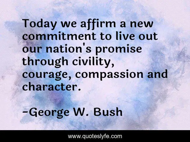 This page presents the quote "Today we affirm a new commitment to live out our nation's promise through civility, courage, compassion and character.". Author of this quote is George W. Bush. This quote is about compassion, character, today,.