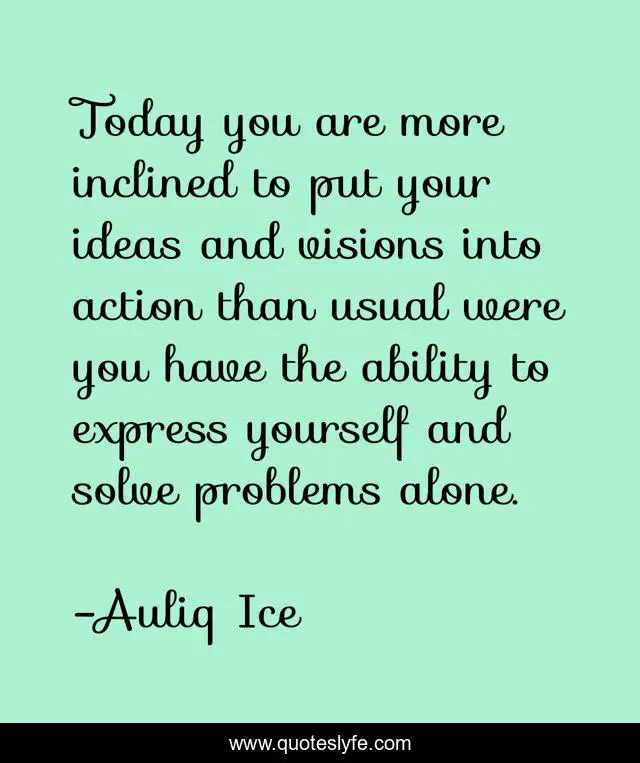 This page presents the quote "Today you are more inclined to put your ideas and visions into action than usual were you have the ability to express yourself and solve problems alone.". Author of this quote is Auliq Ice. This quote is about new-year, action-speak-louder-than-words, success, self-expression, solving-problems, actions-over-words, good-thoughts, new-year-s-resolutions, good-thinking,.