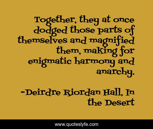 This page presents the quote "Together, they at once dodged those parts of themselves and magnified them, making for enigmatic harmony and anarchy.". Author of this quote is Deirdre Riordan Hall, In the Desert. This quote is about new-adult, angst, romance, harmony, anarchy, love-is-like,.