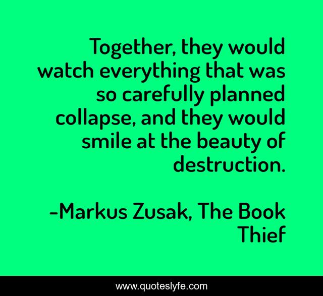 This page presents the quote "Together, they would watch everything that was so carefully planned collapse, and they would smile at the beauty of destruction.". Author of this quote is Markus Zusak, The Book Thief. This quote is about failure, death, destruction,.