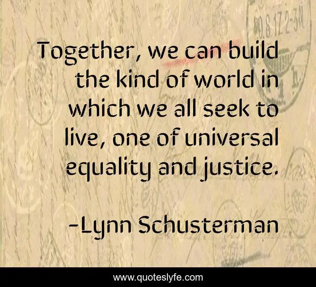 This page presents the quote "Together, we can build the kind of world in which we all seek to live, one of universal equality and justice.". Author of this quote is Lynn Schusterman. This quote is about justice, world, together,.
