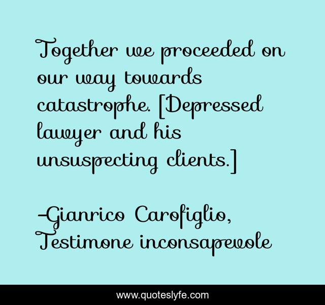 This page presents the quote "Together we proceeded on our way towards catastrophe. [Depressed lawyer and his unsuspecting clients.]". Author of this quote is Gianrico Carofiglio, Testimone inconsapevole. This quote is about depression, involuntary-witness, lawyer,.