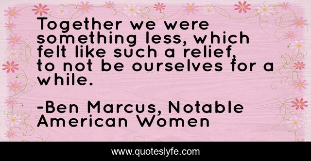 This page presents the quote "Together we were something less, which felt like such a relief, to not be ourselves for a while.". Author of this quote is Ben Marcus, Notable American Women. This quote is about isolation, loneliness, unity, relief, escape, togetherness,.