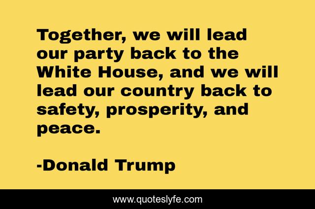 This page presents the quote "Together, we will lead our party back to the White House, and we will lead our country back to safety, prosperity, and peace.". Author of this quote is Donald Trump. This quote is about party, safety, together,.