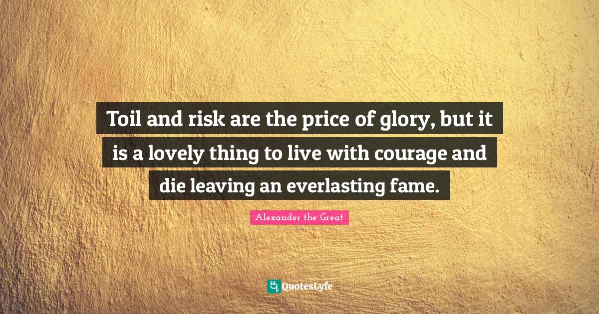 This page presents the quote "Toil and risk are the price of glory, but it is a lovely thing to live with courage and die leaving an everlasting fame.". Author of this quote is Alexander the Great. This quote is about courage, leaving, toil, fame, risk, lovely, everlasting, glory,.