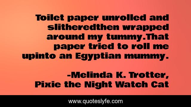 This page presents the quote "Toilet paper unrolled and slitheredthen wrapped around my tummy.That paper tried to roll me upinto an Egyptian mummy.". Author of this quote is Melinda K. Trotter, Pixie the Night Watch Cat. This quote is about humor, children-s-picture-books, rhyme, picture-book, children-s-picture-book, cat, cats, sleep, bedtime,.