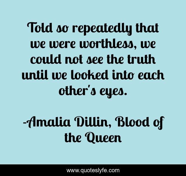 This page presents the quote "Told so repeatedly that we were worthless, we could not see the truth until we looked into each other's eyes.". Author of this quote is Amalia Dillin, Blood of the Queen. This quote is about self-worth, wisdom,.