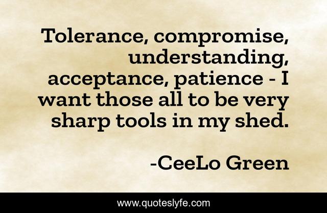 This page presents the quote "Tolerance, compromise, understanding, acceptance, patience - I want those all to be very sharp tools in my shed.". Author of this quote is CeeLo Green. This quote is about acceptance, tools,.