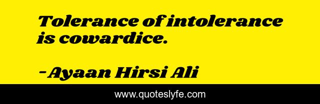 This page presents the quote "Tolerance of intolerance is cowardice.". Author of this quote is Ayaan Hirsi Ali. This quote is about cowardice, intolerance, tolerance, inspirational, enthusiasm,.