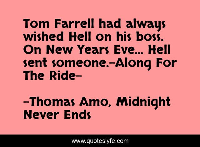 This page presents the quote "Tom Farrell had always wished Hell on his boss. On New Years Eve... Hell sent someone.-Along For The Ride-". Author of this quote is Thomas Amo, Midnight Never Ends. This quote is about possession, horror-fiction, ghosts, anthology, demons,.