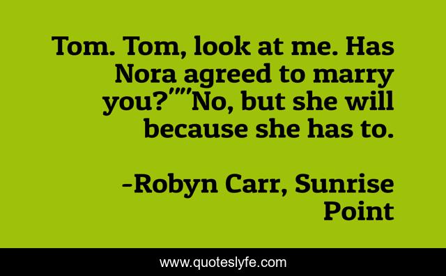 This page presents the quote "Tom. Tom, look at me. Has Nora agreed to marry you?""No, but she will because she has to.". Author of this quote is Robyn Carr, Sunrise Point. This quote is about romance, romantic, humour, robyn-carr,.