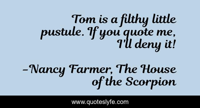 This page presents the quote "Tom is a filthy little pustule. If you quote me, I'll deny it!". Author of this quote is Nancy Farmer, The House of the Scorpion. This quote is about action, science-fiction,.