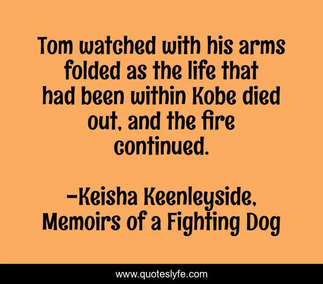 This page presents the quote "Tom watched with his arms folded as the life that had been within Kobe died out, and the fire continued.". Author of this quote is Keisha Keenleyside, Memoirs of a Fighting Dog. This quote is about animal-cruelty, pets, dogs, cruelty, sad,.