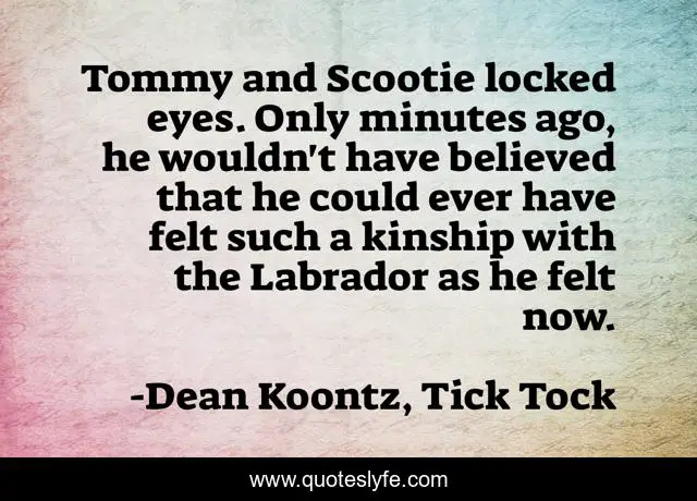 This page presents the quote "Tommy and Scootie locked eyes. Only minutes ago, he wouldn't have believed that he could ever have felt such a kinship with the Labrador as he felt now.". Author of this quote is Dean Koontz, Tick Tock. This quote is about friendship, running, panic, dogs, humour,.