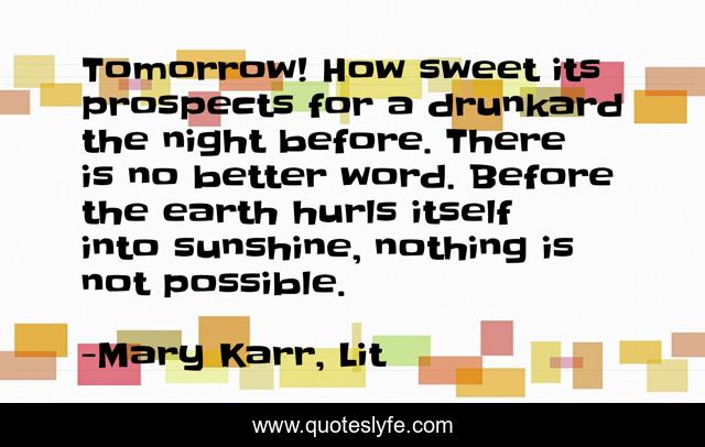 This page presents the quote "Tomorrow! How sweet its prospects for a drunkard the night before. There is no better word. Before the earth hurls itself into sunshine, nothing is not possible.". Author of this quote is Mary Karr, Lit. This quote is about memoir, memoirs, alcoholism,.