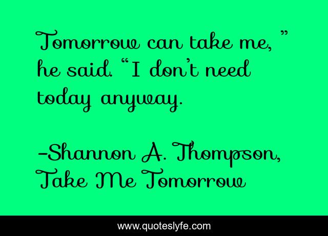 This page presents the quote "Tomorrow can take me, ” he said. “I don’t need today anyway.". Author of this quote is Shannon A. Thompson, Take Me Tomorrow. This quote is about death, past, future, present, time, giving-up, surrender, tomorrow, today,.