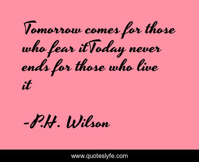 This page presents the quote "Tomorrow comes for those who fear itToday never ends for those who live it". Author of this quote is P.H. Wilson. This quote is about fear, life,.