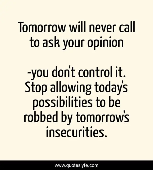 "you don't control it. Stop allowing today's possibilities to be robbed by tomorrow's insecurities. Quotes." Quoteslyfe.com, 2025. Sat. 06 Dec. 2025. <https://www.quoteslyfe.com/quote/Tomorrow-will-never-call-to-ask-your-16988>.