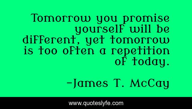 This page presents the quote "Tomorrow you promise yourself will be different, yet tomorrow is too often a repetition of today.". Author of this quote is James T. McCay. This quote is about promise, change, today, tomorrow,.